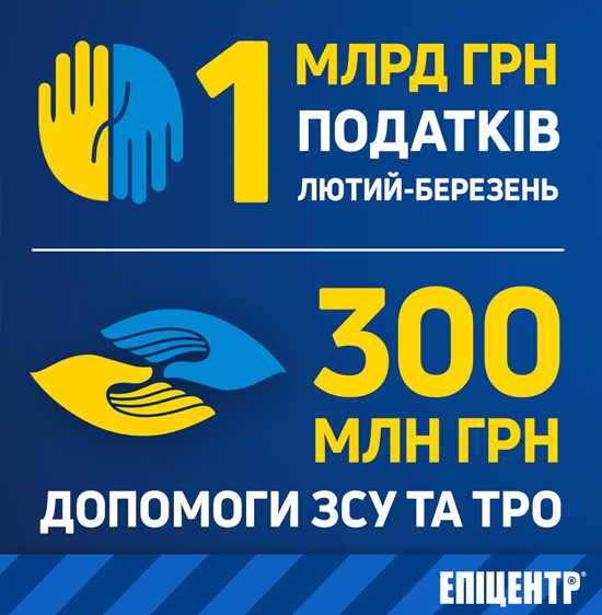 Підтримка Збройних Сил України визначена засновниками та керівництвом компанії пріоритетом №1. За час війни Епіцентр надав потрібну і важливу допомогу нашим захисникам на загальну суму понад 300 млн грн. Ми продовжуємо робити все можливе, щоб якнайшвидше настав омріяний День Перемоги! У столиці та у Західній Україні компанія створила три гуманітарних хаби, куди доставляється допомога з усіх куточків України та Європи.