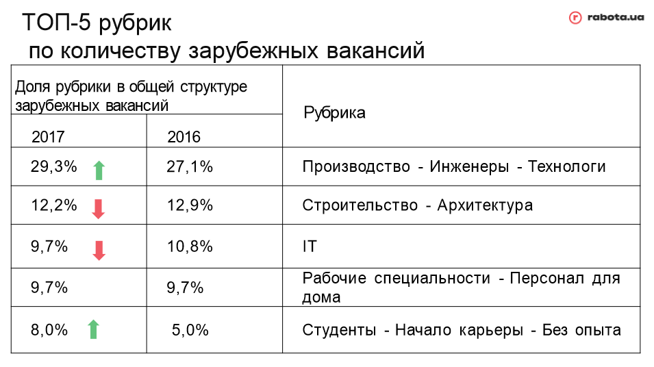 Итоги 2017 года: зарубежный рынок труда. Еще одна печальная новость — зарубежные рынки труда очень активно охотятся за нашими кандидатами. Большая часть наших вакансий за границей — это вакансии посредников, которым платят иностранные работодатели. И для многих наших соискателей услуги такого трудоустройства условно бесплатны, они оплачивают визу, оплачивают билет для того, чтобы подтвердить намерение об уезде, а само трудоустройство для них абсолютно бесплатно. Раньше из 1900 зарубежных вакансий 900 вакансий были польские, сейчас польских вакансий одна треть. То есть у заробитчан увеличился выбор. Польша — одна из самых недорогих стран по заработным платам, но одновременно Польша самая гостеприимная страна. На втором месте Германия, до этого была Чехия, Литва набирает дальнобойщиков и строителей, и также Словакия.