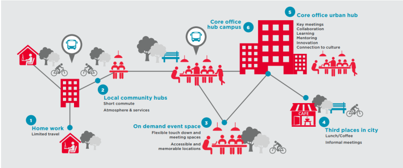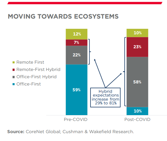Міжнародна консалтингова компанія Cushman & Wakefield спільно з науковцями американського університету Джорджа Вашингтона провела опитування лідерів ринку комерційної нерухомості в різних країнах світу на тему трансформації офісного простору після пандемії. Результати дослідження опубліковано у звіті «Екосистеми робочих місць майбутнього». Респонденти (а це власники об’єктів нерухомості, які управляють активами на загальну суму близько 900 млрд дол. США, орендарі офісних будівель із загальним річним доходом у 574 млрд дол. США, а також директори з розвитку бізнесу компаній, які разом займають понад 35 млн кв. м офісних площ) розповіли про те, що планують змінити в управлінні командою, організації офісного простору та застосуванні гібридного формату роботи.