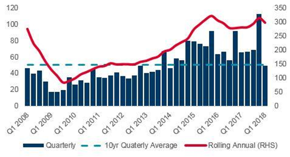 После рекордного объема квартальных инвестиций в размере €112 млрд. в четвертом квартале прошлого года, активы самого лучшего качества по всей Европе становятся все более дефицитными по мере созревания экономического цикла. Это привело к тому, что первые три месяца этого года были наименее активным кварталом за период с 2014 года в точки зрения размера инвестиций в сумме €49 млрд.