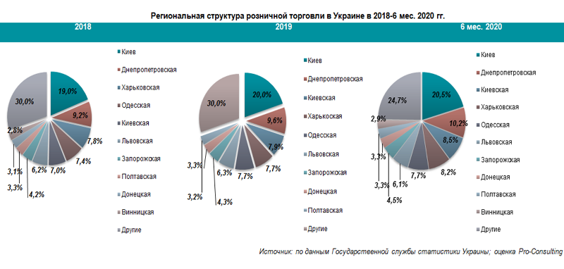 Региональная структура розничной торговли в Украине представляет собой следующую картину. Бесспорным лидером среди региональных центров Украины является Киев, где покупательская способность почти на 80 процентов выше, чем в среднем по стране. В Киеве ежегодно наблюдается прирост доходов населения, что вполне объясняет рост его доли общей региональной структуре товарооборота. Кроме того, следует отметить, что в общей структуре товарооборота превалируют регионы с более высокими средними заработными платами, а увеличение и сокращение доли конкретной области в общем объеме розничной торговли, в свою очередь, совпадает с колебаниями этого показателя.