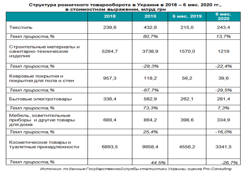 Таким образом, в 2018-2020 гг. можно отметить спад объемов продаж строительных материалов, санитарно-технических изделий, а также покрытий для пола и стен, что связано прежде всего с замедлением темпов строительства в Украине. Помимо этого, такое сокращение связано с общим падением доходов населения, следовательно, товары «премиум-класса» вытесняют более дешевые аналоги. Однако, не смотря на сокращение продаж строительных материалов и прочих товаров для ремонта, украинцы все же уделяют должное внимание обустройству собственного жилья, что вполне объясняет рост объема таких категорий товаров, как текстиль, мебель и осветительные приборы, бытовая техника и пр. Ежегодно значительный прирост наблюдается в объемах розничной торговли косметическими товарами. К факторам, влияющим на этот показатель, прежде всего можно отнести влияние моды, расширение игроков индустрии красоты в Украине в целом, а также расширение ассортимента торговых сетей во всех ценовых категориях. Однако пандемия и тотальный локдаун в первом полугодии 2020 года наложили свой значительный отпечаток на украинский рынок непродовольственного ритейла. Большинство торговых точек в нашей стране не функционировали, либо же работали в ограниченном режиме, что повлекло за собой спад объема продаж практически во всех сегментах.