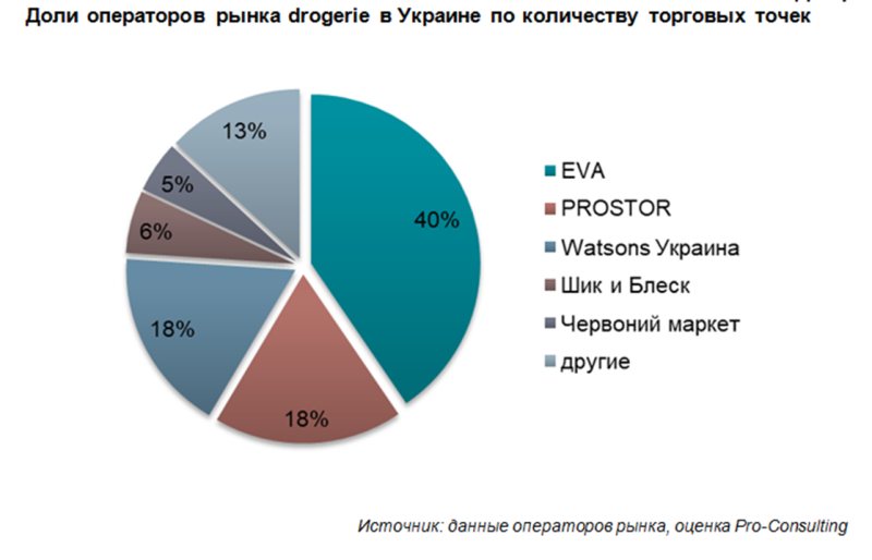 В процентном соотношении показатели количества торговых точек на украинском рынке drogerie выглядит следующим образом. Около 40% всех торговых точек данного сегмента принадлежат сети магазинов «Eva». Доля на рынке таких сетей как «PROSTOR» и «Watsons» составляет по 18%. На долю же линий магазинов «Шик и Блеск» и «Червоний маркет» приходится 6% и 5% соответственно. Однако отдельно стоит заметить, что для оценки доли операторов рынка не были взяты в учет локальные операторы, а также торговые точки на иных торговых площадках.