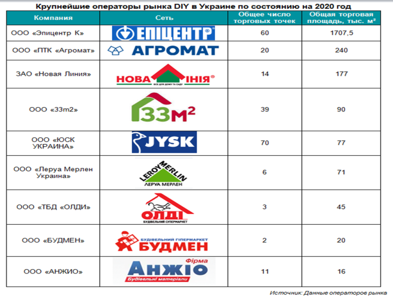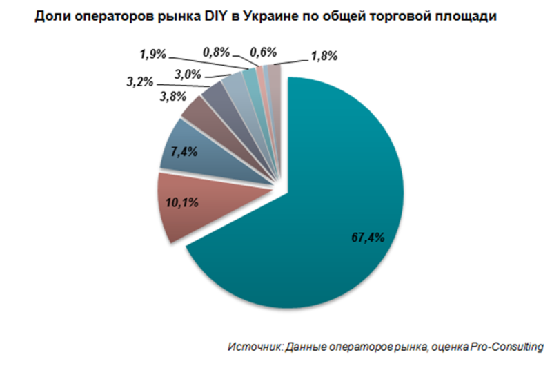 Отдельно стоит заметить, что на украинском рынке преобладают в сегменте DIY крупные строительные гипермаркеты. В целом, рынок сосредоточен вокруг нескольких крупных компаний. Единоличным лидером является ООО «Эпицентр К», который за последние 10 лет подмял под себя более половины всего рынка данного сегмента. Рынок DIY нельзя назвать ориентированным на широкое развитие, поскольку оно протекает вертикально, а не горизонтально, что подразумевает расширение уже существующих сетей, а не создание новых.